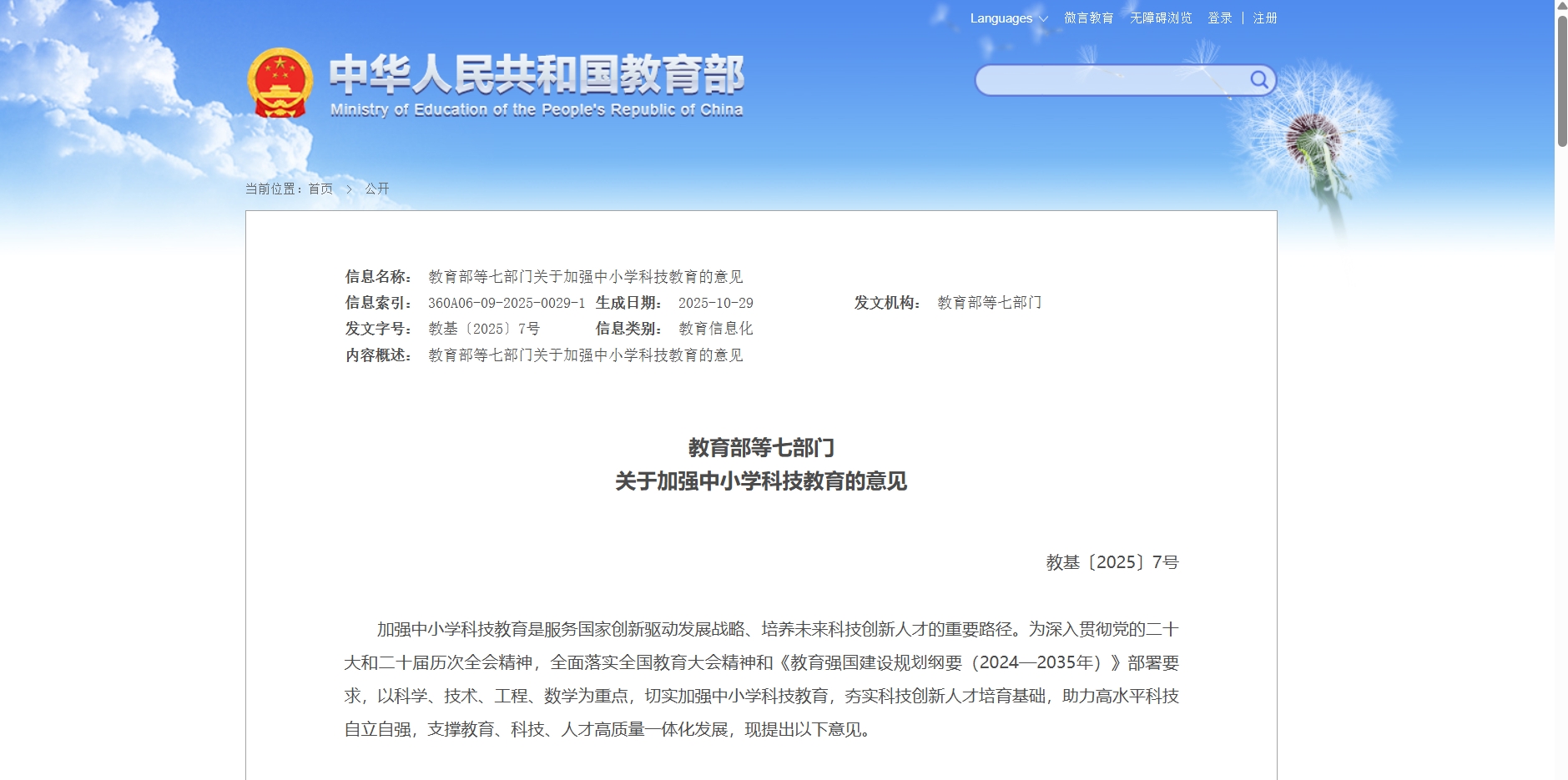 正如《意见》所强调:“科技教育不是少数人的‘精英游戏’,而是面向每个孩子的‘普惠工程’。”从今天起,让我们一起期待:当科学的种子在千万个校园里生根发芽,中国的科技创新未来,将拥有无限可能。